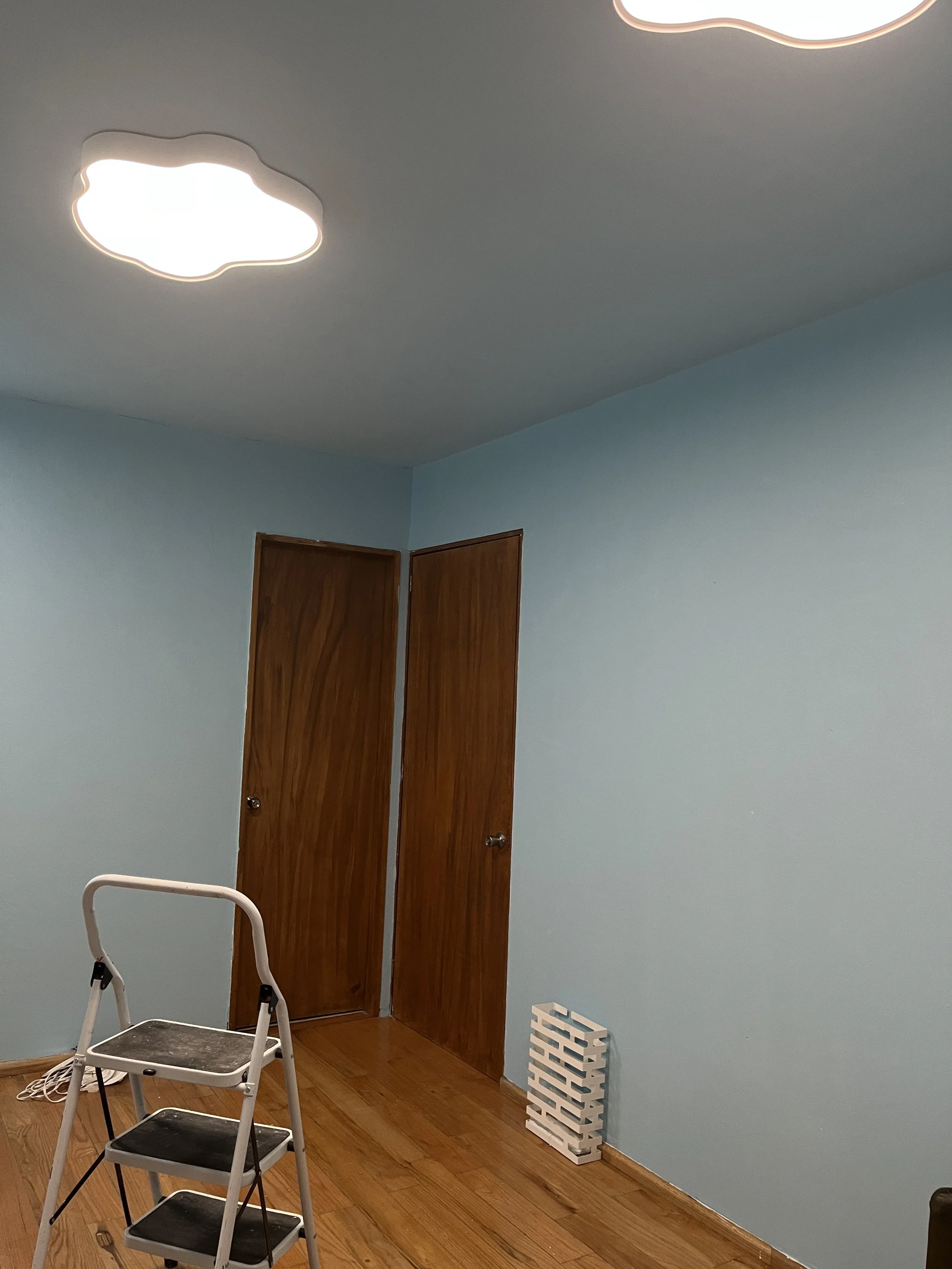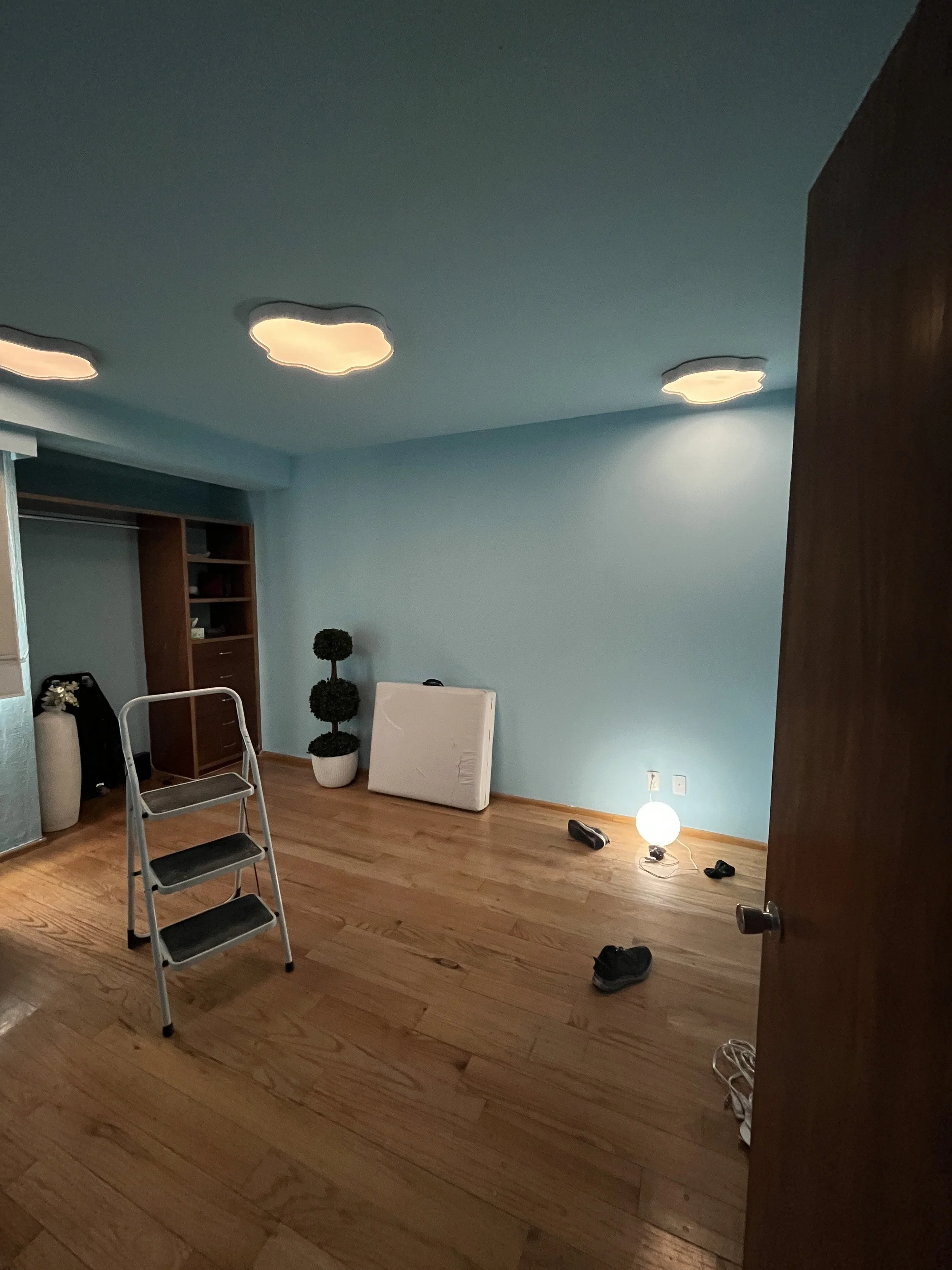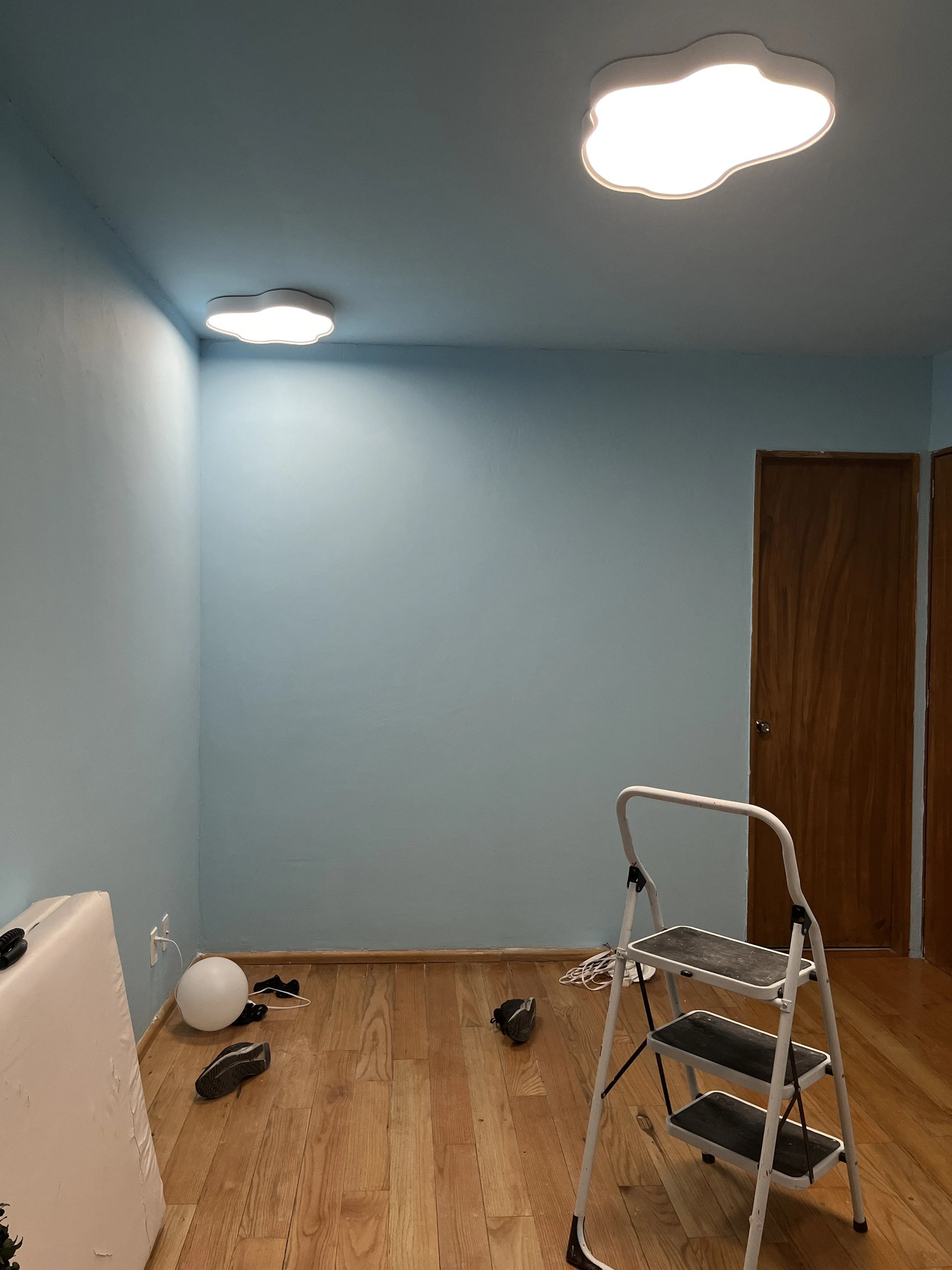 I’m including a few photos of the pilot room I’m building — I’ve actually transformed the second bedroom in my apartment to test out this “floating on a cloud” design concept. So far, I’ve painted the space and added some of the lamps I mentioned earlier… but they give off way too much light for a treatment room. That’s exactly where I feel your designs could elevate the space.